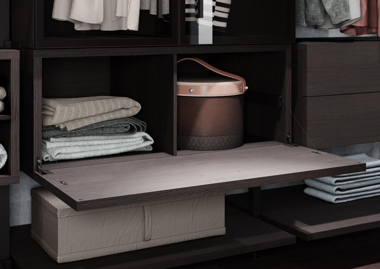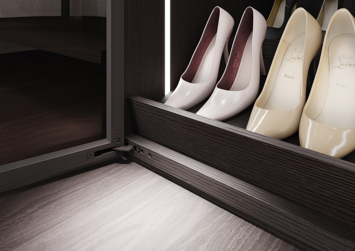 Akcesoria i bieliznę zawsze najlepiej jest trzymać osobno. Praktyczna będzie szuflada z indywidualnymi przegródkami na drobniejsze dodatki jak apaszki, paski, a nawet okulary przeciwsłoneczne. Ciekawym i wygodnym rozwiązaniem jest też specjalny wieszak na torebki, paski lub krawaty, dzięki czemu nie będą się gniotły. W obszernej garderobie można również pomysłowo wyeksponować biżuterię. Wykorzystajmy małe przeszkolone gablotki. Od razu widzimy co jest w środku i łatwo po to sięgnąć. Do butów Raumplus poleca skośne półki z obrzeżami – świetnie je eksponują i pomagają utrzymać wnętrze mebla w czystości.