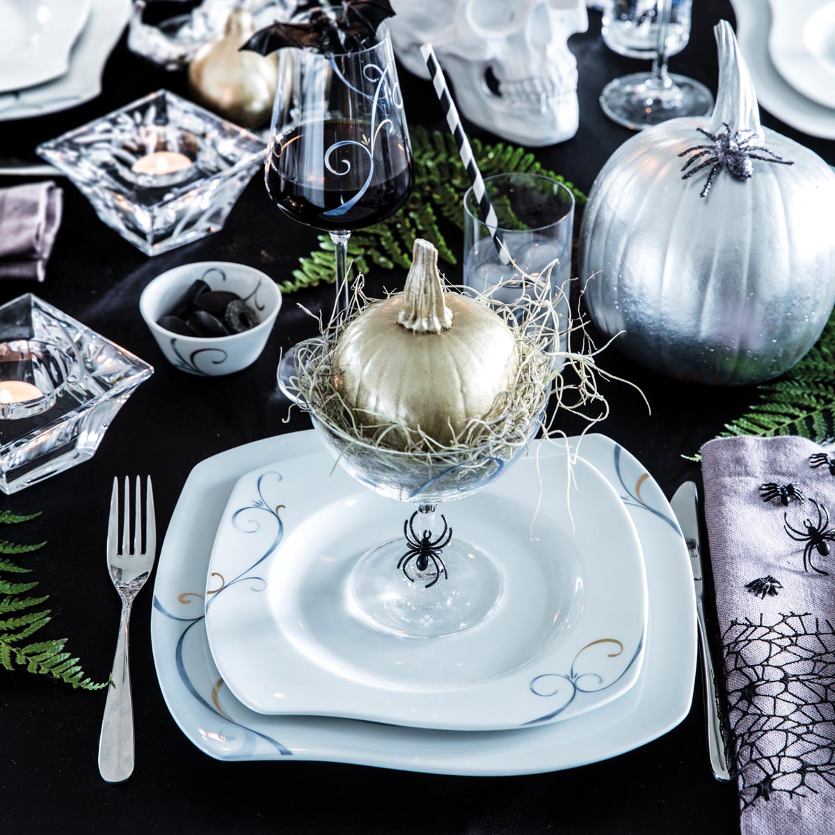 Biel porcelany VICTORIA w halloweenowej aranżacji będzie doskonale kontrastowała z ciemnym, wyrazistym obrusem. A co z dodatkami? Warto zdecydować się na takie w odcieniach srebra, złota czy perłowego różu – oczywiście z połyskiem. Przecież dynie nie muszą być zawsze pomarańczowe! Do tego „straszne motywy” – sztuczne pająki i pajęczyny. I już – halloweenowe przyjęcie w stylu glamour gotowe. Można czekać na gości…