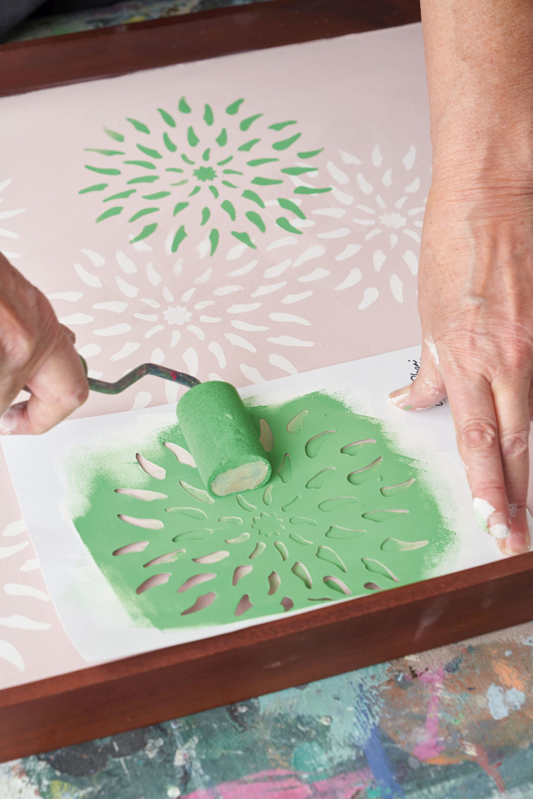 Kiedy dekoracje w kolorze Pure są gotowe, powtórz krok 3 używając farby w kolorze Antibes Green. W wybranych miejscach przykładaj szablon częściowo na wzory już wykonane: zarówno te w kolorze białym, jak i zielonym. Pozwól farbie wyschnąć.
