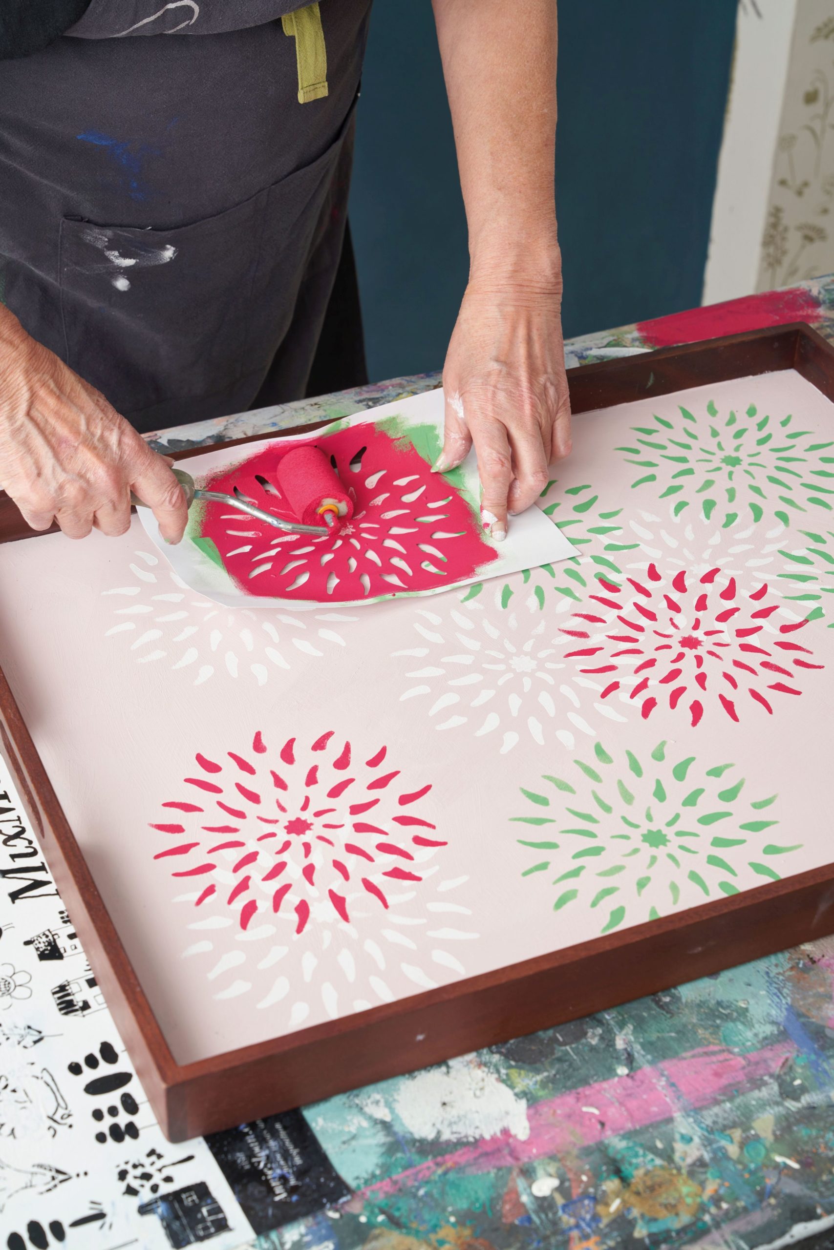 Nie trzeba daleko szukać, aby znaleźć pomysł na efektowne i łatwe do wykonania dekoracje. Inspiracji dostarczy przyroda, a kolory wprost z letniego ogrodu odkryjemy w aktualnej palecie farb kredowych Annie Sloan. Tym razem ich twórczyni wzięła na warsztat drewnianą tacę, aby nadać jej wakacyjny klimat i retro look. Niezbędne do tego będą farby w kilku odcieniach oraz szablon z kwiatowym wzorem. Annie używa autorskiego szablonu dołączonego do najnowszego wydania poradnika „The Colourist”. – Szablon został zainspirowany uproszczonym abstrakcyjnym wzorem kwiatowym, po który chętnie sięgali w latach 60. ub.w. brytyjscy projektanci, jak Mary Quant oraz fińska marka Marimekko. Aby stworzyć naturalny efekt, jak kwiaty na łące, miejscami nakładam wzór na siebie, a w innych miejscach zachowuję większe odstępy pomiędzy kwiatami – wyjaśnia Annie. Możesz również śmiało użyć dowolnego szablonu z florystycznym motywem, spośród dostępnych w sklepach z artykułami malarskimi. Annie Sloan poprowadzi Cię krok po kroku przez kolejne etapy metamorfozy. Lato już zawitało, a więc do dzieła!