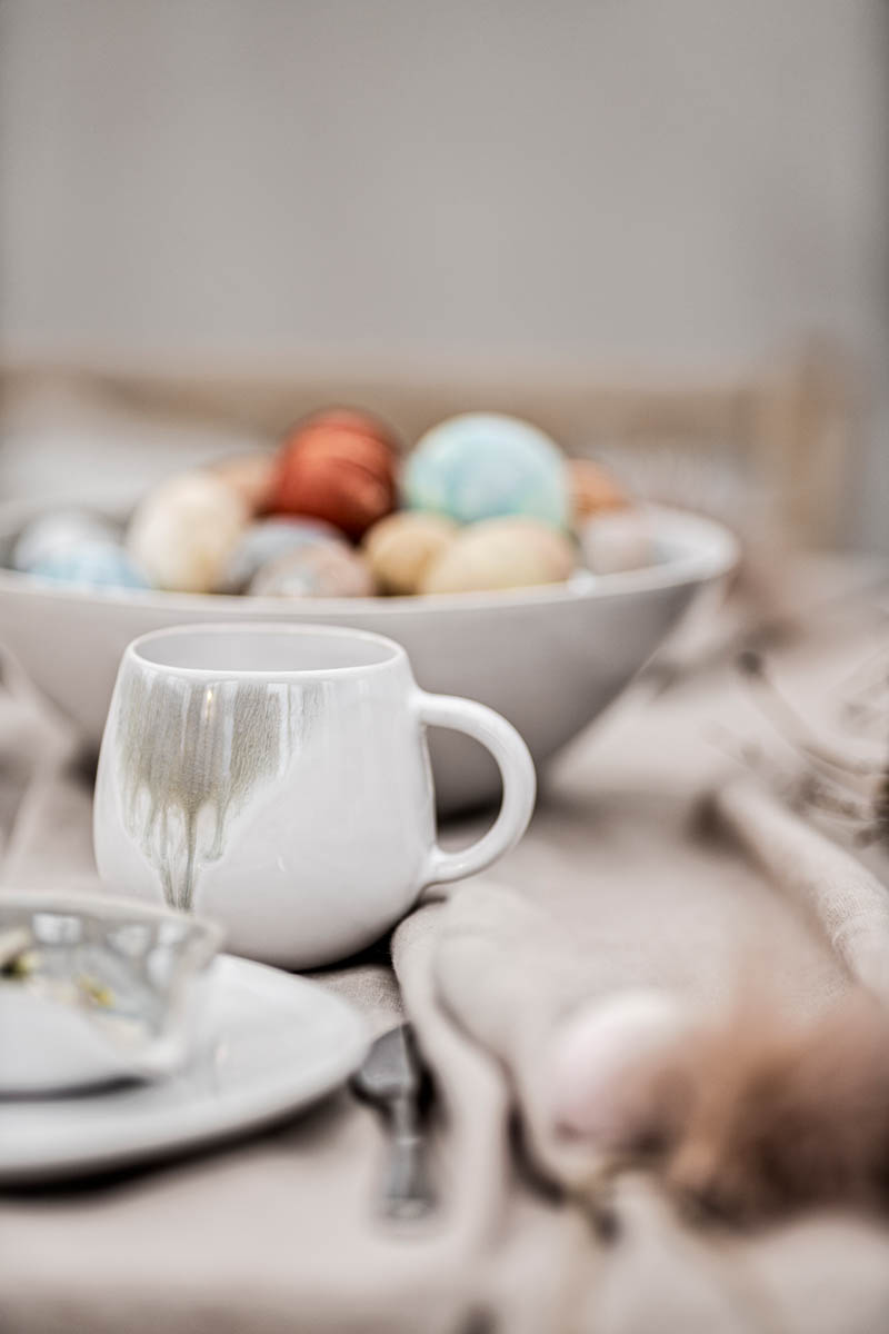Zupełnie odmienny styl zapewni kamionkowa zastawa WAVE, inspirowana odcieniami morza i wyrażająca tęsknotę za słońcem. Z jej użyciem stworzymy wyjątkową, rustykalną aranżację, wypełnioną naturalnymi akcentami i spokojną paletą barw – szarościami i beżami. Ręcznie wykonane i szkliwione elementy kolekcji WAVE wyróżniają się niepowtarzalnym charakterem, a razem tworzą niezwykłą, harmonijną całość. Drewniany stół, lniane tkaniny w swobodnych formach, naturalnie zdobione jajka, ozdobione piórkami bazie i wierzbowe gałązki dopełnią całości.